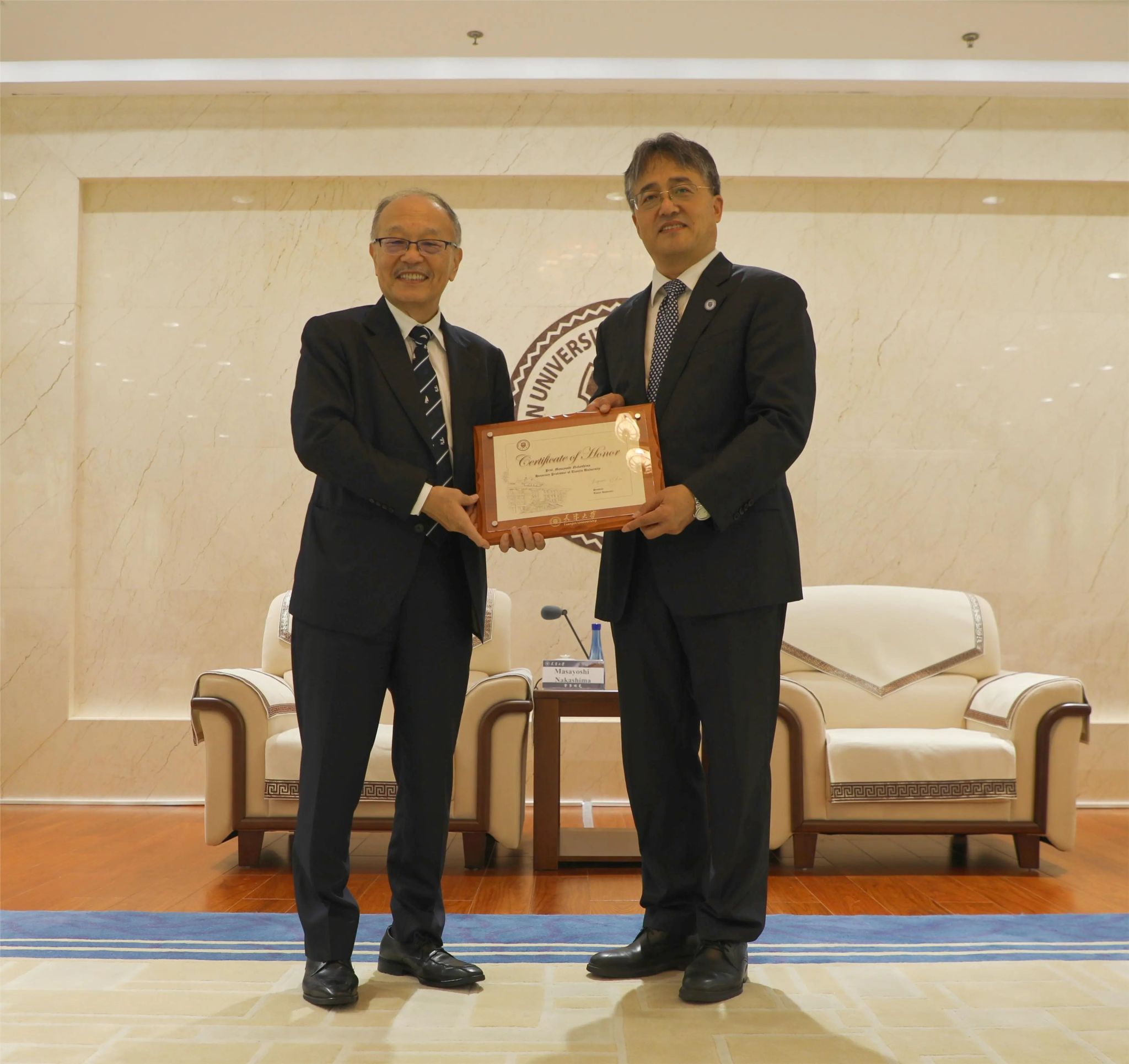 天津大学党委副书记、国家地震工程科学中心主任韩庆华为中岛正爱颁发名誉教授证书。中岛正爱在致辞中回顾了与天大的合作历程,对获授名誉教授称号表达感谢,并表示将持续推动双方在地震工程研究领域的深入合作。国际处、建工学院、国家地震工程科学中心办公室等有关负责同志参加。